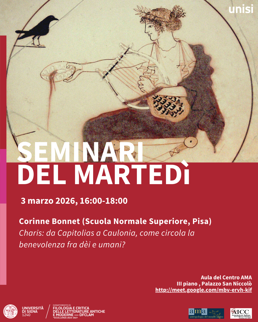 tema: "Charis: da Capitolias a Caulonia, come circola la benevolenza fra dèi e umani?" Scarica la locandina L'incontro si svolgerà presso l'Aula del Centro AMA (III Piano Palazzo San Niccolò - Via Roma, 56 Siena).