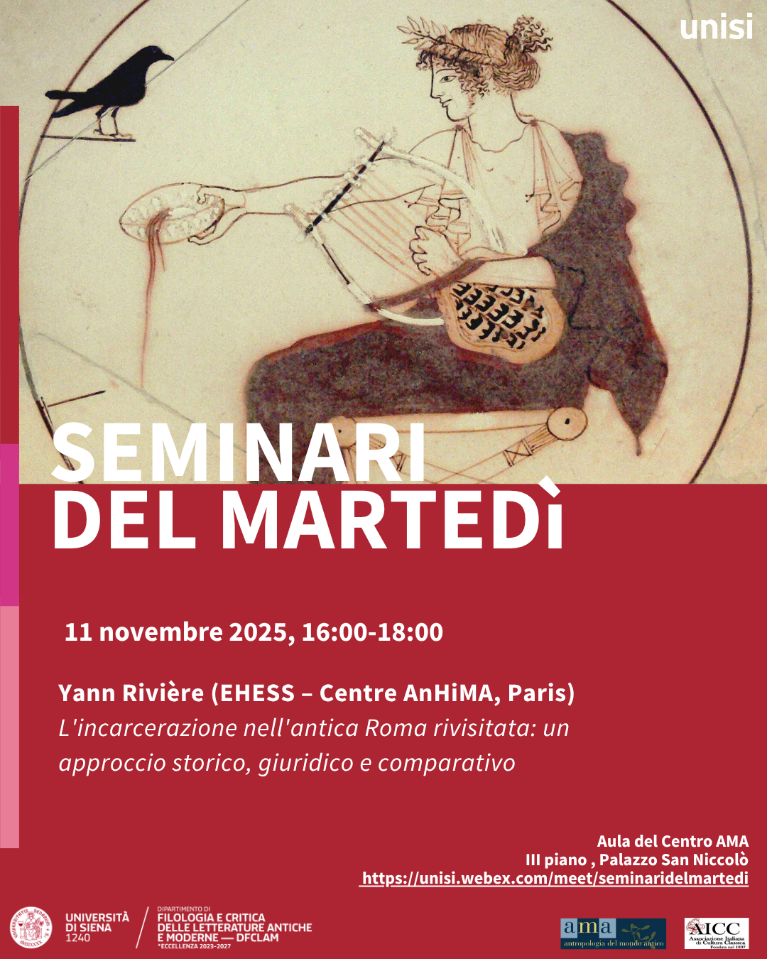 25 giugno ore 16: nuovo appuntamento de "I libri del Centro AMA" Si è svolto lo scorso mercoledì 25 giugno alle ore 16 presso l'Aula 447 (IV Piano Palazzo S. Niccolò, Via Roma, 56 - Siena) un nuovo appuntamento dell'iniziativa "I libri del Centro AMA", con la presentazione del volume di Carmine Pisano, La religione dei Greci (Carocci 2025). Hanno dialogato con l'autore Anna Angelini (Università di Siena) e Maurizio Bettini (Università di Siena) Scarica la locandina